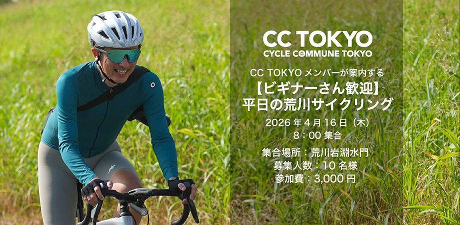 イベント詳細 楽しく安全に豊かなサイクルライフを。をテーマに会員制サイクルコミュニティ活動を続ける「CC TOKYO」が主催するサイクリングイベントです。今回のイベントは非会員の方も参加可能。初心者の方から経験者の方まで、サイクリング好きな方なら大歓迎。普段CC TOKYOメンバーが楽しむ「荒川サイクリングの定番ルート」ご案内いたします。荒川河川敷、何があるの?どういうルートが走りやすいの??そんな疑問も解決します。サイクリング好きな方々が繋がれる場としてもぜひ活用してください。そして今回は平日木曜日に開催!平日休みの方はぜひご参加ください!