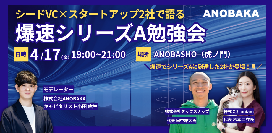 ANOBAKA(https://anobaka.jp/)はプレシード・シード投資に特化したベンチャーキャピタルです。2016年4月より開始し順調に投資活動を進め投資先は230社を超えました。多くのスタートアップ投資を行ってきましたが、シリーズA調達に駆け上がるスピードは様々です。今回は厳しいマーケットの中でも、目をみはる速度で事業成長し、爆速でシリーズA調達に成功した起業家をゲストにお招きし、プレシード・シード期の戦略・戦術を学ぶ勉強会を実施します。