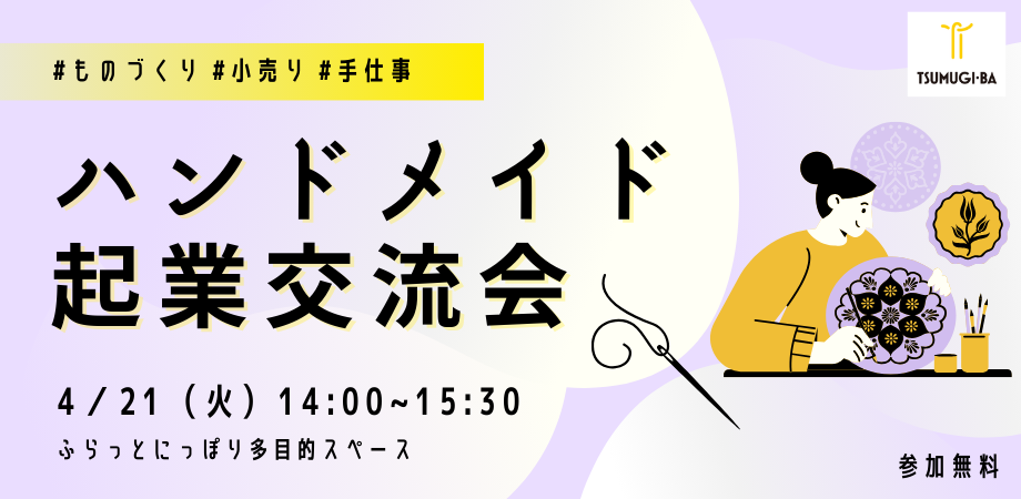 「今は趣味だが、ハンドメイドでいつか起業したい」「ハンドメイドで起業したがなかなか売上が伸びない」そんな思いや悩みを抱える方は少なくないのではないでしょうか。今回は、ハンドメイドで起業した方、起業準備中の方向けの交流会を開催します。本イベントは、ワークショップなども交え、自身の事業について知ってもらい・参加者同士の交流ができるプログラムとなっています。一人で抱えがちな悩みを共有したい、普段はなかなか人に出会えない方など、新たなつながりを作るきっかけや、事業を推進するモチベーションアップにお役立てください。本イベント会場の「ふらっとにっぽり」は、布屋が立ち並ぶ日暮里繊維街の中腹に位置する施設です。イベントを通じて日暮里エリアの起業家とつながりたい方も歓迎です。