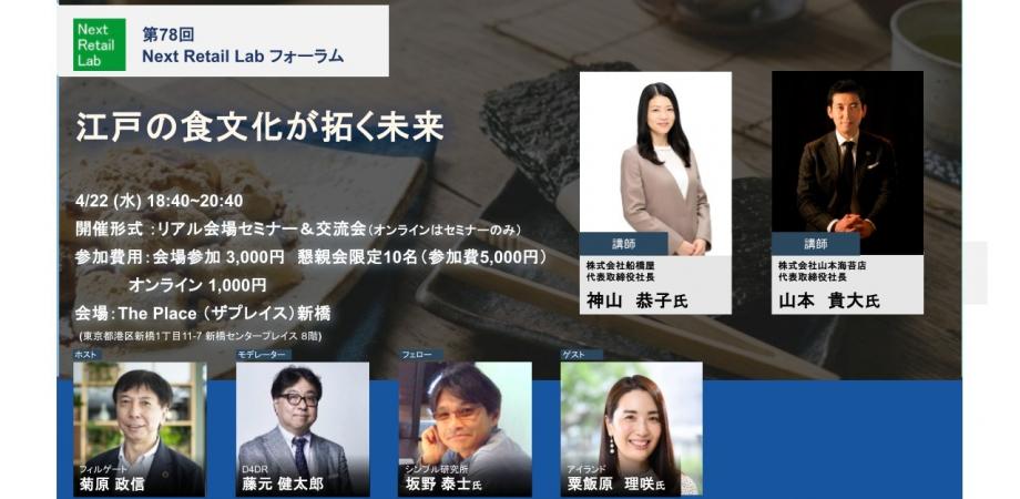 第78開催 Next Retail Lab フォーラム Next Retail Lab毎年恒例、老舗企業の方に登壇していただきます。今回のテーマは、「江戸の食文化が拓... powered by Peatix : More than a ticket.