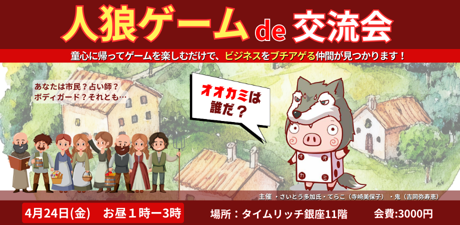 イベント詳細 【みんな、人狼ゲームしようぜ!】※大谷翔平風に「たかがゲーム」と侮ることなかれ。人狼ゲームは、大人でも一度遊んだら病みつきになる、ある意味、怖いゲームです。しかも人数が多ければ多いほど楽しめるという・・・・・そんな面白いコンテンツ、交流会にぴったりじゃん!と盛り上がったさいとう多加氏、てらこ(寺崎美保子)、鬼(吉岡弥寿恵)がコラボして、人狼ゲームを楽しむ交流会を開くことにしました。開催地は銀座。参加しない手はありません。スケジュールを抑えて、今すぐ「参加する」ボタンを押してください。