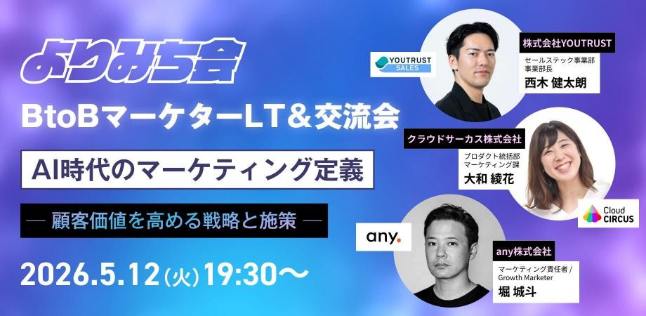 今回株式会社YOUTRUST、クラウドサーカス株式会社、any株式会社の3社に登壇いただき、「AI時代のマーケティング定義 ─ 顧客価値を高める戦略と施策 ─」についてお話いただきます。サービスのブランドづくりにおけるマーケティング活動の戦略や、具体的な施策などの事例を学べる会です。新しい視点や具体的なヒントを得られる場となれば幸いです。