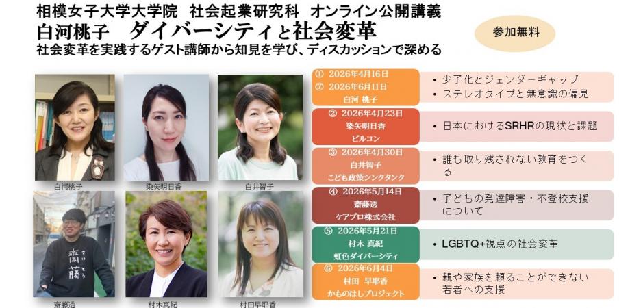 イベント詳細 このオンライン公開講義「ダイバーシティと社会変革」は相模女子大学の社会起業めざす社会人大学院の授業となります。