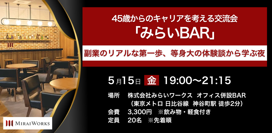 イベント詳細 45歳からのキャリアを考える交流会「みらいBAR」~副業のリアルな第一歩、等身大の体験談から学ぶ夜~
