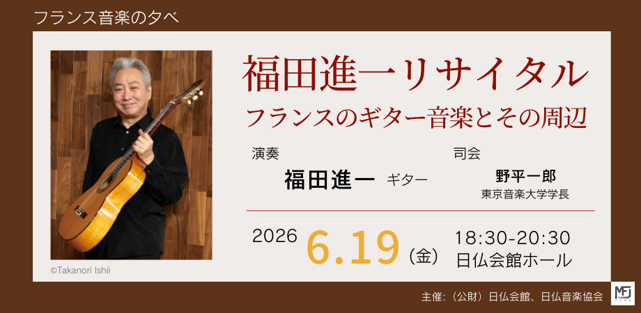 日本で最も著名なギタリストの一人、福田進一を迎えて、フランスで生まれたギター作品を中心としたリサイタルを行います。取り上げる時代は幅広く、バロック期から現代まで。リュリやド・ヴィゼー、ラモーなどのルイ王朝時代の作品、スペインの作曲家ソルがフランスの古い歌をテーマにして作曲した有名な変奏曲、そして20世紀に入り、サマズイユ、ルーセル、イベール、プーランク、ジョリヴェ、オハナ、そして現代スペイン屈指の作曲家ビセンテ・アセンシオまで、フランスのギター史を一望するプログラムです。