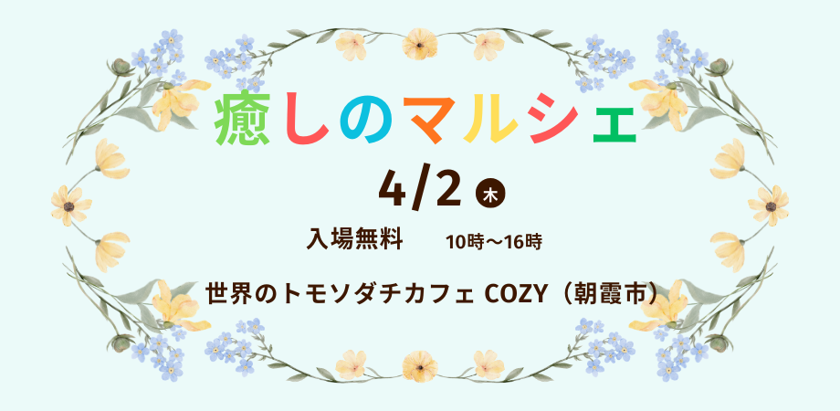 イベント詳細 埼玉県朝霞市にある「世界のトモソダチカフェCOZY」で、癒しのマルシェを開催します。
