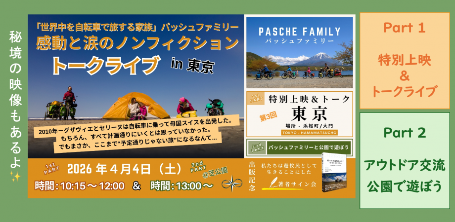 今回は、日本語版書籍『私たちは遊牧民として生きることにした』(ぞうさん出版)の出版を記念して開催する特別イベントです。さらに、まもなく日本を発つパッシュファミリーに会える、最後の東京イベント となります。