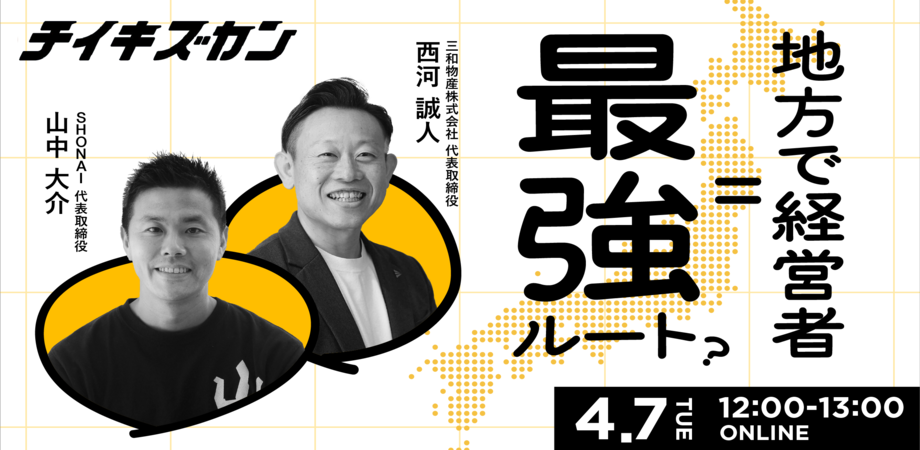 本イベントでは、「地方で経営者になる」選択肢のリアルと、そのキャリアとしての魅力を深掘りします。実際に地方企業への転職から代表就任までを歩んだ三和物産・西河誠人社長が出演。「経営者に憧れはあったが、入社時は社長を目指していなかった」——その西河社長が、どのような判断と行動を重ねて経営者になったのか。意思決定のプロセスを、本人の言葉で紐解いていただきます。「支援する側」ではなく「経営する側」へ。その一歩を具体的に考えたい方のためのイベントです。『自分にもできるかも』と思ったあなたを、お待ちしています。