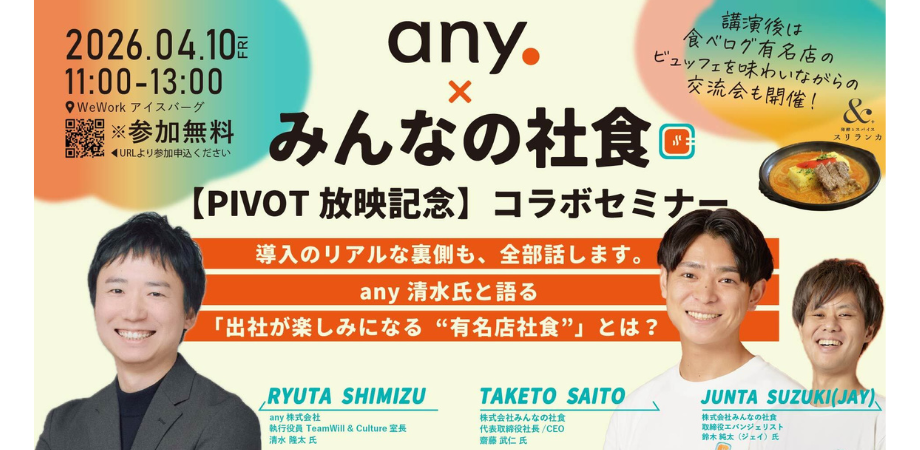 イベント詳細 今回のイベントでは、PIVOTの放映では語りきれなかった経営層が直面する「組織の一体感の低下」や「出社率の低下」といった経営課題に対して有名店の料理を提供する新しい社食がどのような効果をもたらすのか、導入企業のany清水様とともに掘り下げています。リアルな裏側も含めて、本音で語り尽くします。