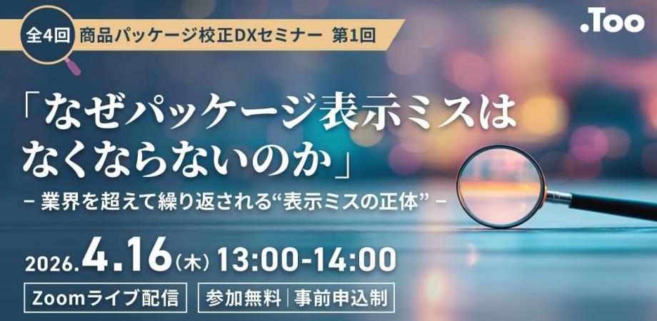 第1回:「なぜパッケージ表示ミスはなくならないのか」― 業界を超えて繰り返される“表示ミスの正体” ―第2回:業界横断で考える“表示リスクの減らし方”― 再発防止を仕組みに変える共通デジタル基盤とは ―(2026年5月開催予定)第3回:再現性のある仕組みを整えると、表示リスクはどう変わるのか― 構造から見直す校正DX ―(2026年6月開催予定)第4回:成功企業に学ぶ、再発防止を仕組みに変え始めた校正DXの現在地(2026年7月開催予定)
