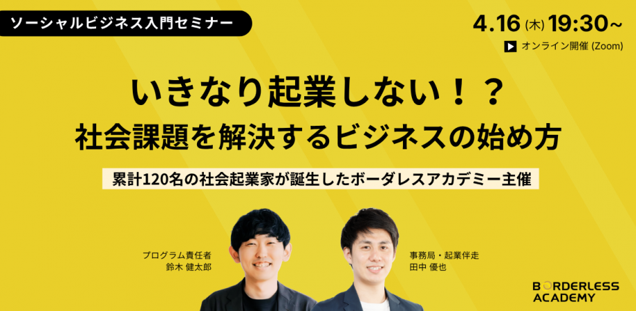イベント詳細 累計120名以上の社会起業家が誕生!社会課題を解決する力を育てるソーシャルビジネススクール「ボーダレスアカデミー」が、入門セミナーを開催します。