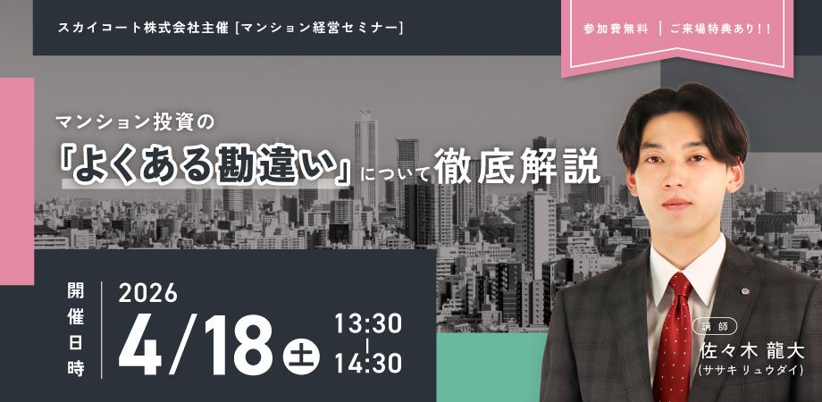 開催形式/オンライン・会場開催日時/2026年4月18日(土) 13:30-14:30オンライン詳細/ZOOM ※13:15以降にアクセスしてください会場詳細/スカイコート本社2F セミナールーム 住所:東京都新宿区富久町8-22 スカイビル 受付開始(開場):13:00 都営新宿線「曙橋」駅A1出口から徒歩5分 東京メトロ丸ノ内線「四谷三丁目」駅2番出口から徒歩7分 「市ヶ谷富久町」バス停留所からすぐ会場の定員/50名参加費/無料