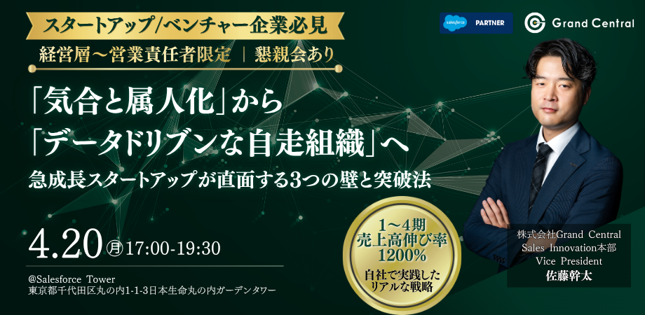 本イベントでは、4年売上成長率1200%を達成したGrandCentralが、急激な組織拡大に伴うマネジメントの限界、属人化脱却という自社のSalesforce導入ニーズに基づきながら、実践した「売上予測の可視化 」「営業の型化」の事例とノウハウを公開します。