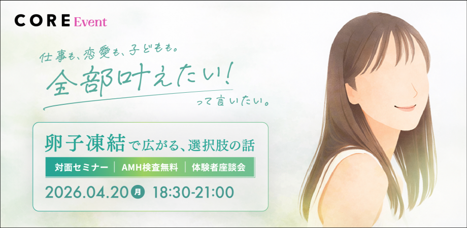 イベント詳細 仕事、もっと頑張りたい。 でも、将来のことも、ちゃんと考えておきたい。そのふたつを、諦めなくていい。キャリアに本気な女性ほど、「妊娠・出産のタイミング」に悩みます。昇進のタイミングと重なりそう、今は仕事に集中したい、でもいつかは子どもを持ちたい気持ちもある——そんな本音、誰かに話せていますか?今回のイベントは、働く女性のコミュニティ「CORE」×卵子凍結保管サービスを提供している「Grace Bank(グレイスバンク)」が初コラボ。医師によるセミナーと、当日その場で受けられるAMH検査(血液検査)を通じて、自分の体の今を知るきっかけをつくります。
