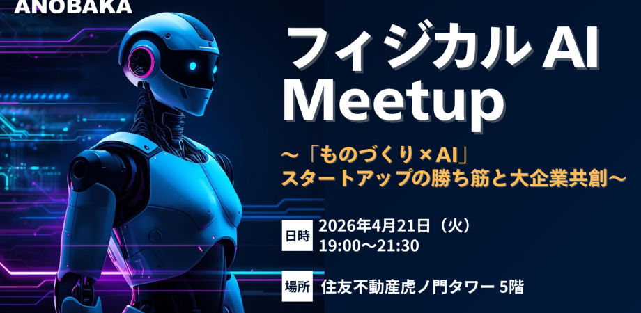 【こんな方におすすめです】・フィジカルAI領域の起業家・起業準備中のエンジニア・研究者・有望スタートアップとの協業・PoCを模索する大手事業会社の新規事業・R&D担当者 【概要】・日時:4月21日(火)19:00〜21:30・場所:ANOBASHO(虎ノ門) 〒105-0001 東京都港区虎ノ門二丁目2番1号 住友不動産虎ノ門タワー グロース虎ノ門5階・定員:40〜50名想定(※本イベントは承認制となります) 【アジェンダ】19:00〜19:10 イントロダクション19:10〜19:30 導入:フィジカルAIトレンド解説(なぜ今注目されているのか・米国事例など)19:30〜20:30 パネルセッション+質疑応答 ・フィジカルAI開発の難しさと「死の谷」の越え方 ・フィジカルAIスタートアップのモートは何になるのか ・大企業とのPoCを成功させるポイント など20:30〜21:30 交流会