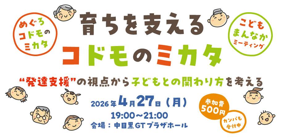 開催日:2026年4月27日(月)開催時間:19:00〜21:00会場:中目黒GTプラザホール(目黒区上目黒2-1-3 中目黒GT テラス棟地下1階)定員:60名参加費:500円(会場で現金払いのみ/会場費・印刷費などに充当させていただきます。)カンパも受付中!主催:めぐろコドモのミカタ/めぐろ子ども子育て連絡会/ 特定非営利活動法人目黒子ども劇場後援:目黒区