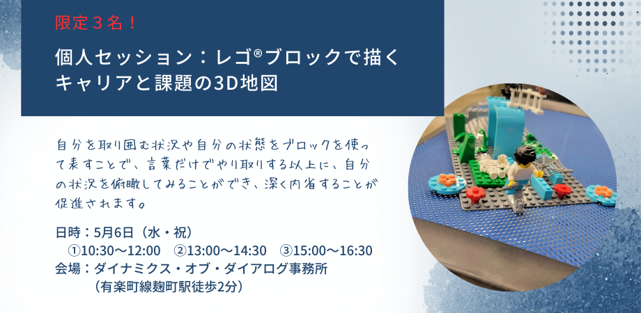 イベント詳細 レゴ®シリアスプレイ®(LSP)は、理念や戦略の策定、チームビルディング、キャリア開発など様々な目的に活用されています。LSPのワークショップでは、一人ひとりがファシリテーターが発する質問について、専用のレゴ®ブロックセットを使って3D作品を作ります。3Dモデルはグループで話し合い、知識を共有して問題解決と意思決定をするために使われます。今回、そんなLSPのアプローチを参考にしながら、個人の課題を明確にしたり、解決策を検討するための個人セッションを行います。