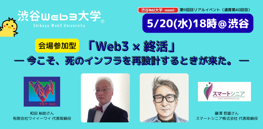 渋谷Web3大学 -season2- 第9回目リアルイベント(通算第40回目) 「Web3 × 終活」── 今こそ、死のインフラを再設計するときが来た。 ── ※本イベ... powered by Peatix : More than a ticket.