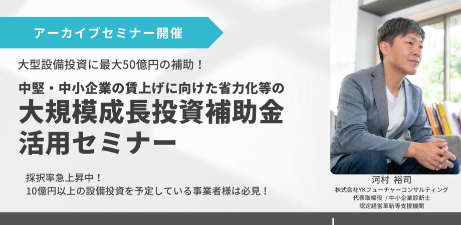 本ウェビナーでは、補助金活用の専門家が「大規模成長投資補助金」の公募要領や活用方法、採択につながるポイント等について、どこよりも分かりやすく解説いたします。「第4次公募に向けて情報を集めておきたいという方」も大歓迎です!採択率急上昇中!10億円以上の設備投資を予定している事業者様は今がチャンス。ご参加をお待ちしております!