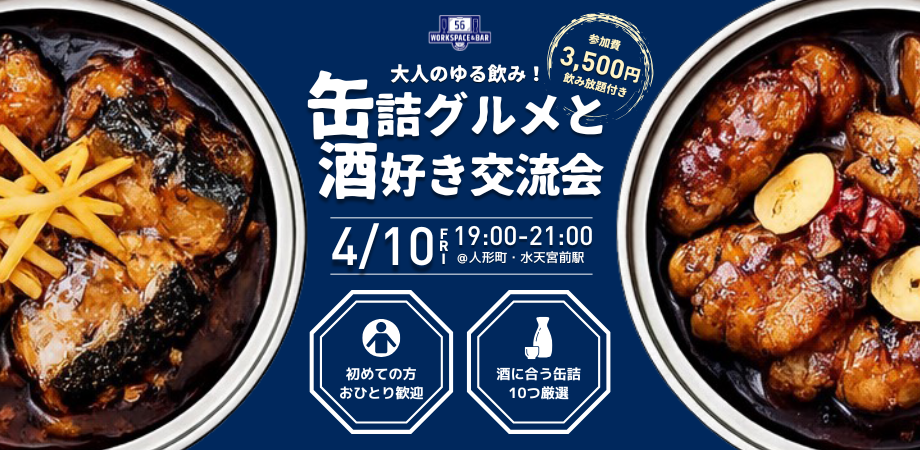 ▼日時2026年4月10日(金)19:00-21:00 ※受付 18:50~▼対象者20歳以上の社会人の方(お一人さま大歓迎!)▼参加費3,500円(税込)※アルコール・ソフトドリンク飲み放題※20:30ラストオーダー▼定員20名程度(事前予約制)▼会場Workspace & Bar 56(東京都中央区日本橋人形町2-21-1 FSビル 5F)▼アクセス東京メトロ日比谷線「人形町」駅から徒歩2分東京メトロ半蔵門線「水天宮前」駅から徒歩3分都営地下鉄新宿線「浜町」駅から徒歩6分▼備考・当店でお酒に合う缶詰めを厳選してご用意します。・現金非対応の店舗となります。 飲み放題以外のメニューでドリンク注文をされる際はQRコード決済、電子マネー、クレジットカードなどご用意ください。