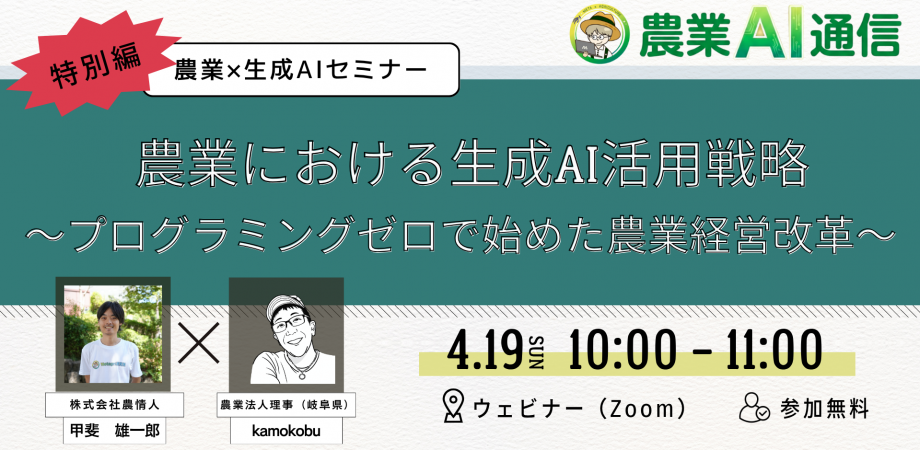 ■開催概要・タイトル: 農業における生成AI活用戦略 ~ スプレッドシートとAIだけ。プログラミングゼロで始めた農業経営改革 ~・日時: 2026年4月19日(日)10:00〜11:00・会場: オンライン(Zoom)・対象者: ✅品種ごとの収益が「なんとなく」しか分からない農家 ✅経営に数字を取り入れたい農業法人の後継者・経営者 ✅農業×AIに関心のあるビジネスパーソン ✅高額なシステムなしで経営改善に取り組みたい方■参加費・一般チケット: 無料・アーカイブ付きチケット: 無料(Metagri研究所会員証NFTホルダー専用)※アーカイブ付きチケットをご希望の方は、[Metagri研究所コミュニティ会員証NFT]をお求めください。