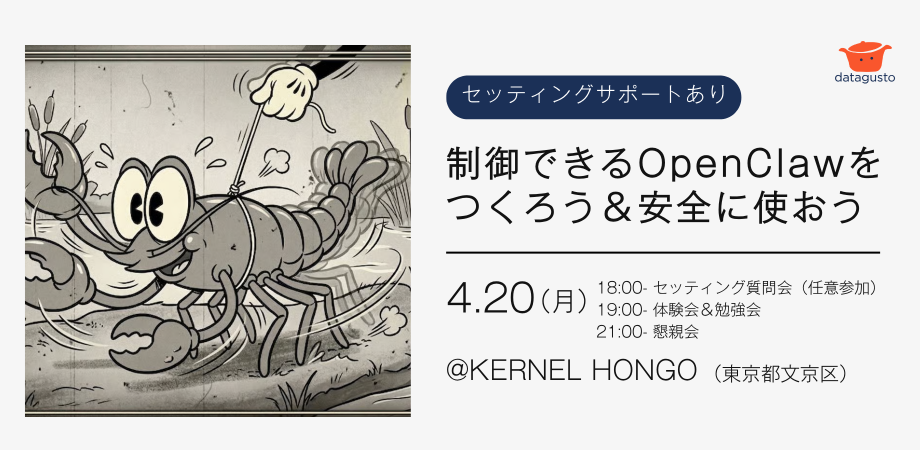 ご自身でセッティングしたOpenClawで参加いただいてもOKですし、未導入の方についてはdatagustoがセッティングをサポートいたします(※)。皆でワイワイしながら、OpenClawを使い始めてみましょう!