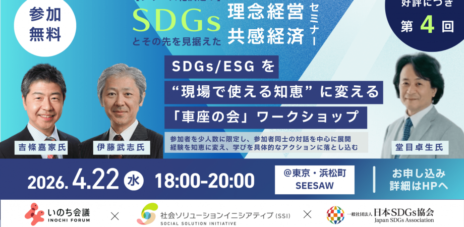 日時:2026年4月22日(水) 18:00 – 20:00(交流会は21:00まで)会場:東京・浜松町 SEESAW 9階参加費:無料主催: いのち会議/一般社団法人 日本SDGs協会/大阪大学 社会ソリューションイニシアティブ(SSI)協力:Kakitsu株式会社、株式会社ジョブオール