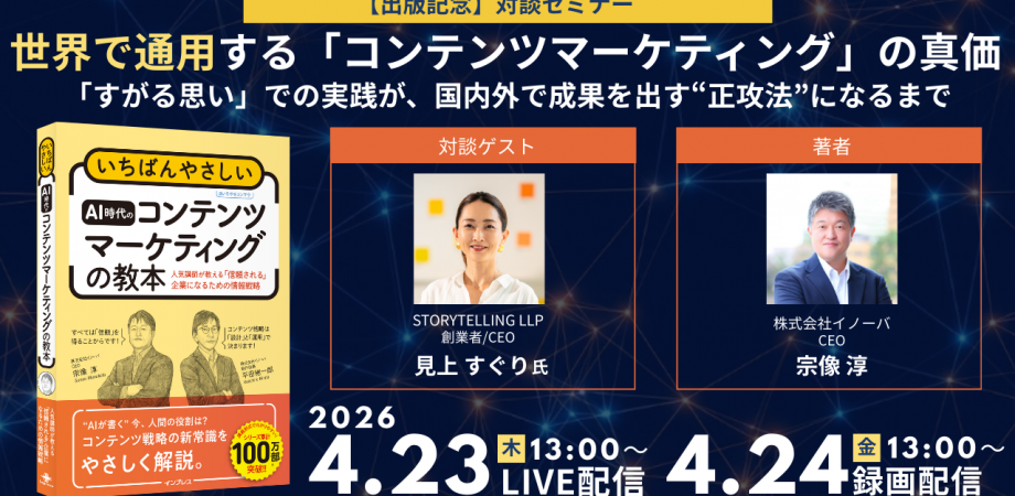 ■セミナー概要イノーバCEO 宗像淳と、執行役員 平田継一郎の共著による書籍『いちばんやさしいAI時代のコンテンツマーケティングの教本』発売を記念して、ゲストをお招きした対談セミナーをシリーズ開催いたします!