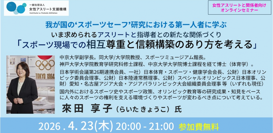 【第8回マンスリーセミナー開催概要】「スポーツ現場での相互尊重と信頼構築のあり方を考える ~いま求められるアスリートと指導者との新たな関係づくり」■開催日時:2026年4月23日(木)20時~21時■講 師: 來田 享子先生(中京大学副学長・スポーツ科学部教授、JOC理事 等)■開催方式:オンライン/ウェビナー■参加費: 無料■主 催: 一般社団法人女性アスリート支援機構 https://i-fa.or.jp/about/
