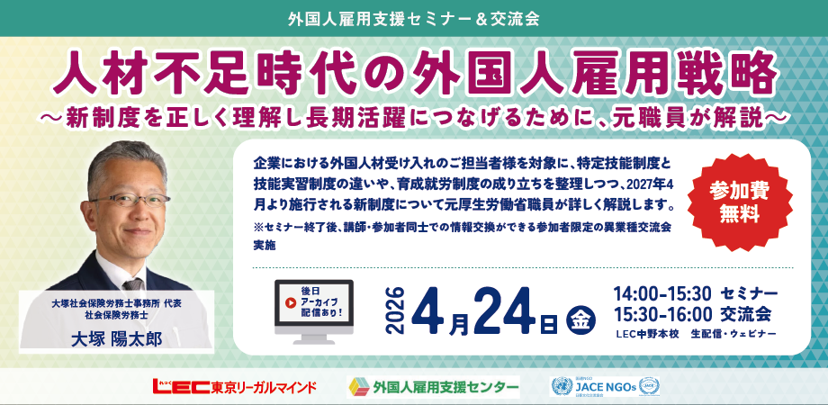 本セミナーでは、厚生労働省本省にて約30年にわたり雇用行政に携わり、制度運用の最前線を経験してきた講師を迎え、2026年2月公表の「運用要領」を踏まえて「育成就労制度」を体系的に解説します。技能実習制度との違いや制度創設の背景を整理しながら、企業が押さえるべき実務ポイントや今後の対応の方向性について、実践的に理解を深めていただくことを目的としています。