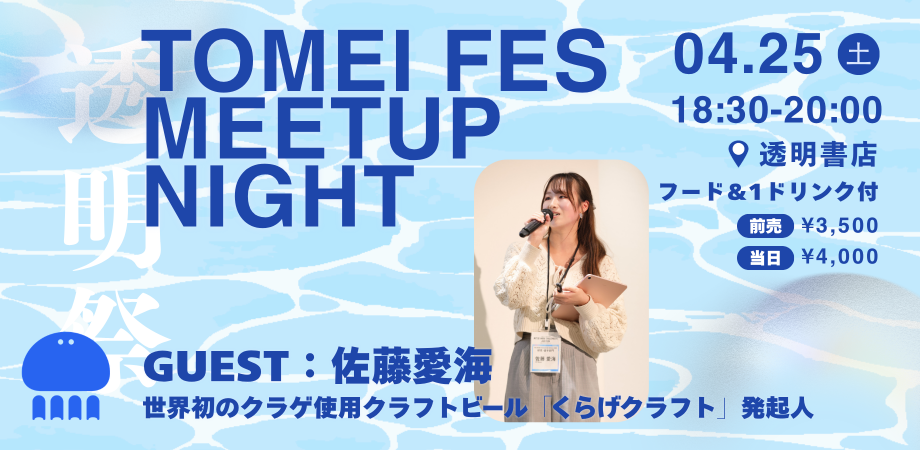 ![TOMEI FES -透明祭- Meetup Night[Guest:「くらげクラフト」発起人・佐藤愛海]](https://cdn.peatix.com/event/4946514/cover-Rq4jb5gArnAqGSOxyycBBdxr91J6UO1c.png)