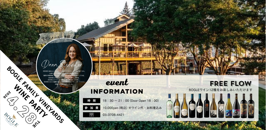 ◆BOGLE FAMILY VINEYARDS WINE PARTY◆ 【ワインメーカー ダナ・ステムラー氏来訪】 造り手にお話を伺いながらワインをいただく貴重な体験です!! 当日... powered by Peatix : More than a ticket.