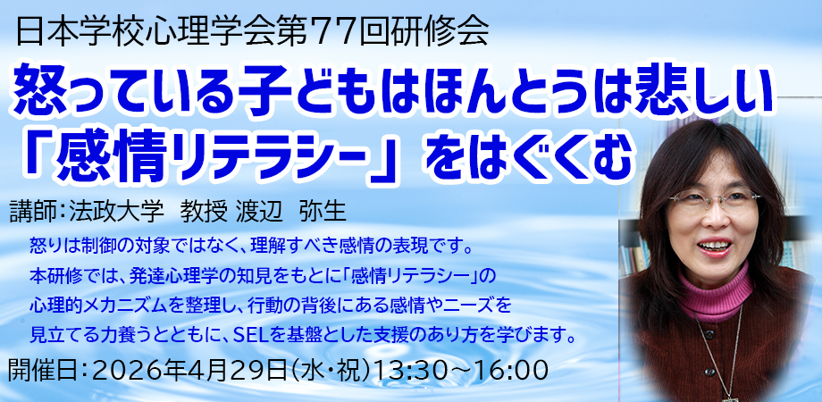 日本学校心理学会第77回研修会 講師:渡辺 弥生(ワタナベ ヤヨイ)先生(法政大学 教授) テーマ:「怒っている子どもはほんとうは悲しい:「感情リテラシー」をはぐくむ... powered by Peatix : More than a ticket.