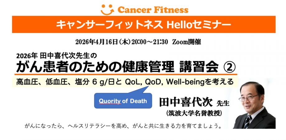 《2026年4月Helloセミナー》 2026年 田中喜代次先生の がん患者のための健康管理 講習会② ー 高血圧、低血圧、塩分 6 g/日と QoL, QoD, Well-be... powered by Peatix : More than a ticket.