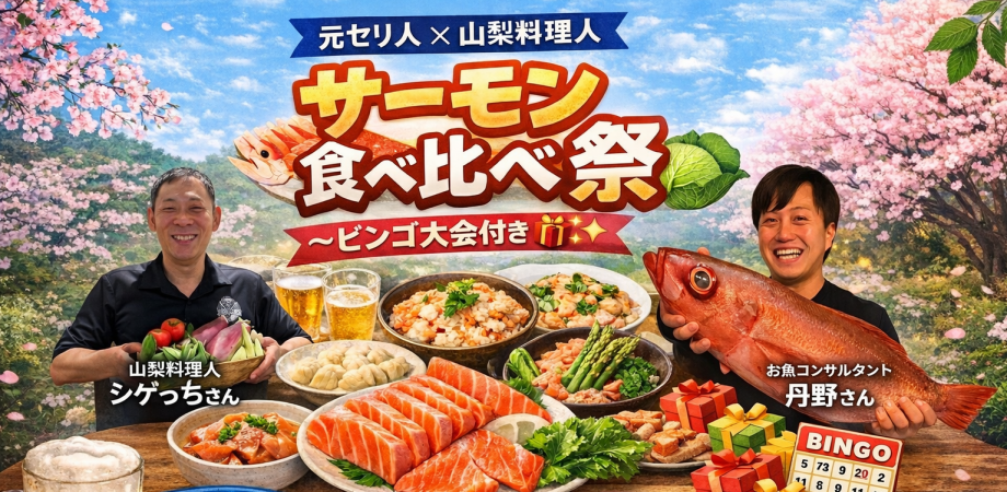 美味しいサーモン料理と山梨の旬野菜、そしてビンゴ大会で盛り上がる楽しい夜を一緒に過ごしましょう!ぜひお気軽にご参加...