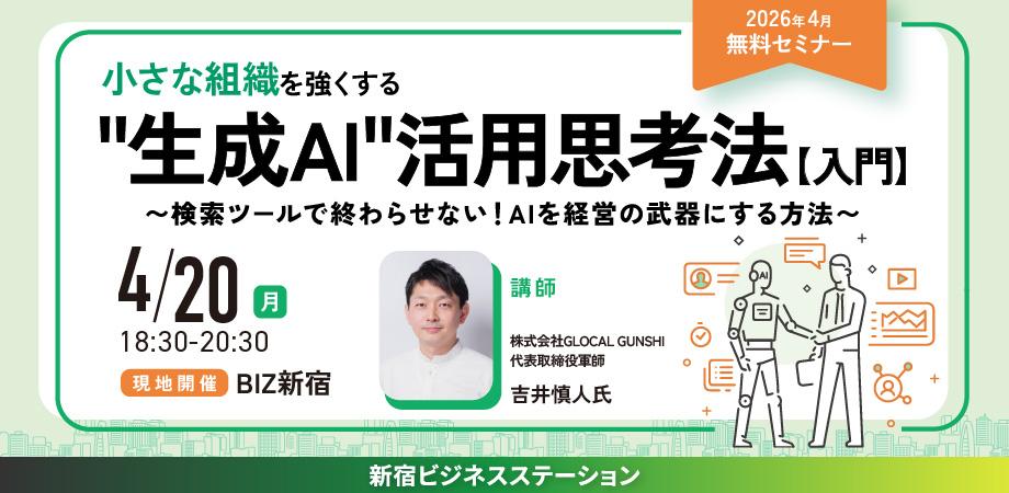 イベント詳細 検索や文書校正には生成AIを使っているものの、もっと実務に活かしたいと考える小規模事業者向け【思考法入門セミナー】です。業務整理、企画立案、意思決定を加速させる具体的なAI活用法を、操作デモとともに解説します。生成AIを単なるツールで終わらせず、経営を支える“右腕”として使いこなすための思考法を身に付けましょう。 <内容>