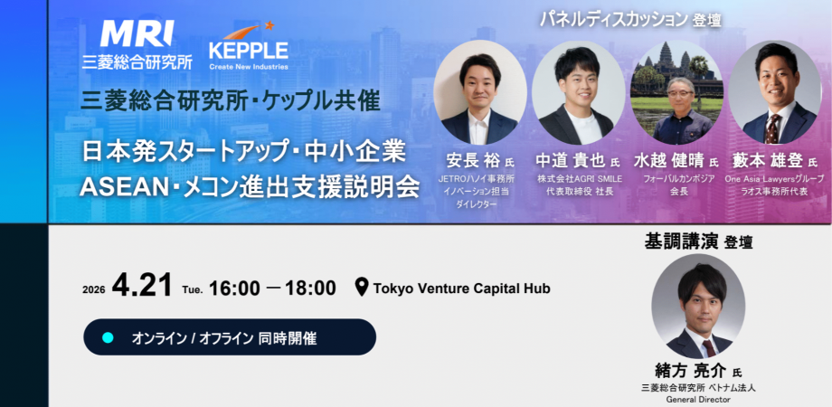 本イベントでは、経済産業省(イノベーション・環境局 イノベーション創出新事業推進課)、中小企業庁(経営支援部海外展開支援室)、JETRO、およびASEANに進出しているスタートアップ起業家をお招きし、MRIV International(三菱総合研究所ベトナム法人)を交えながら、ASEANの中で今後特に高い成長が期待されるメコン地域への進出機会と、具体的な支援プログラムについて発信します。