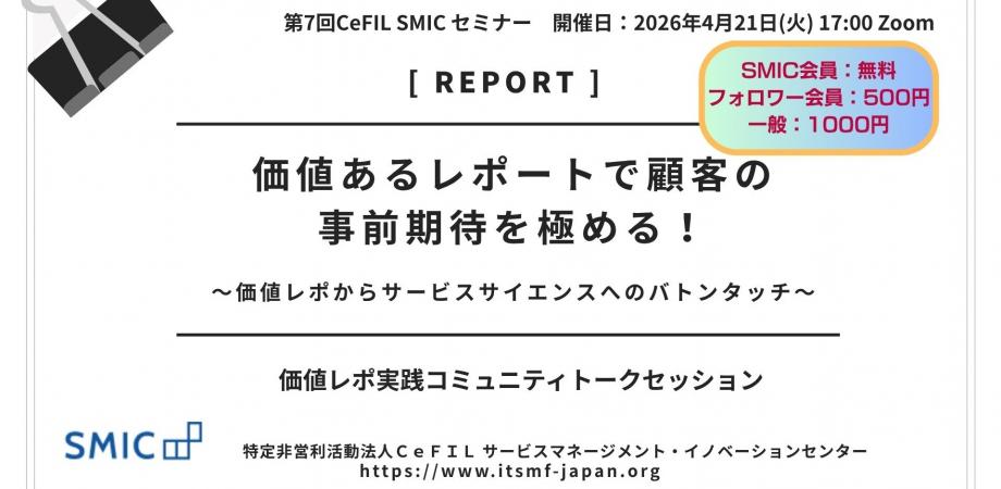 イベント詳細 ■開催概要 開催日時:2026年4月21日(火)17:00~18:00 価値あるレポートで顧客の事前期待を極める!~価値レポからサービスサイエンスへのバトンタッチ~ 開催場所:Zoomによるウェビナー 定 員:50名(申込先着順) 参加費:SMIC会員 無料 、フォロワー会員500円、一般1000円主 催:特定非営利活動法人 CeFIL SMIC ■講演タイトル: 価値あるレポートで顧客の事前期待を極める!~価値レポからサービスサイエンスへのバトンタッチ~ ■講演概要: ITサービスマネジメントを提供するベンダーとして、顧客への報告書や報告会を双方にとって価値のあるものにすることを目指し、分科会やコミュニティ活動を通じて継続的にその改善に取り組んできました。今回は活動の経緯と具体事例をトークセッション形式で紹介します。さらにこれまでの活動は一旦収束・解散し、その発展的な取り組みとして「事前期待による価値の設計」に取り組む、サービスサイエンスコミュニティの活動を新たに開始しており、この活動についてもご紹介します。 ■講演者 猪木 一成 SCSK株式会社 ITインフラサービス事業グループ統括本部 プロジェクト監理部/一般 40数年にわたり、ITサービスマネジメントに従事。ホストから分散、データセンターまで幅広く構築から運用を経験。ここ10年は報告を通したサービス価値の改善活動、後進指導に従事。 平野 慎一郎 NTTデータカスタマサービステクノロジ株式会社 アウトソーシング担当 部長1985年NTT入社、2度の分社化を経験し現職。工事・保守エンジニアから調整・設計・運用まで幅広くITサイクルを経験。itSMFで情報収集している中で2022年に価値レポと出会う。 後藤 裕二 SCSKシステムマネジメント株式会社 産業マネジメントサービス事業本部 リモートマネジメントサービス第一部1982年CSK入社後、運用管理に従事。IT運用サービス高度化の取り組みから価値レポ分科会を知り、価値レポ実践分科会に参加。 小林 理枝ServiceNow Japan合同会社 Product Management ITSM BU...