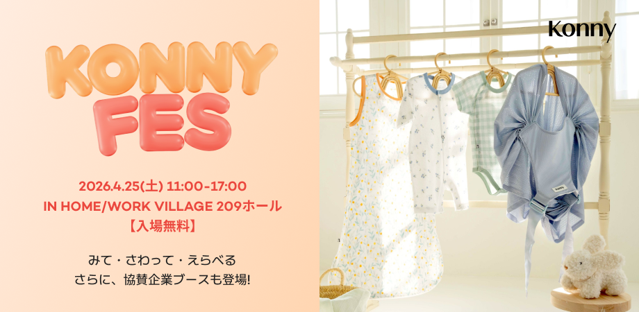 皆さまへの感謝を込めて、コニー初のフェス「KONNY FES」を開催します! これからの季節に大活躍するアイテムを、実際に「みて、さわって、えらべる」特別な1日。専門スタッフによる抱っこ紐の試着サポートや、豪華な来場特典もご用意してお待ちしております。