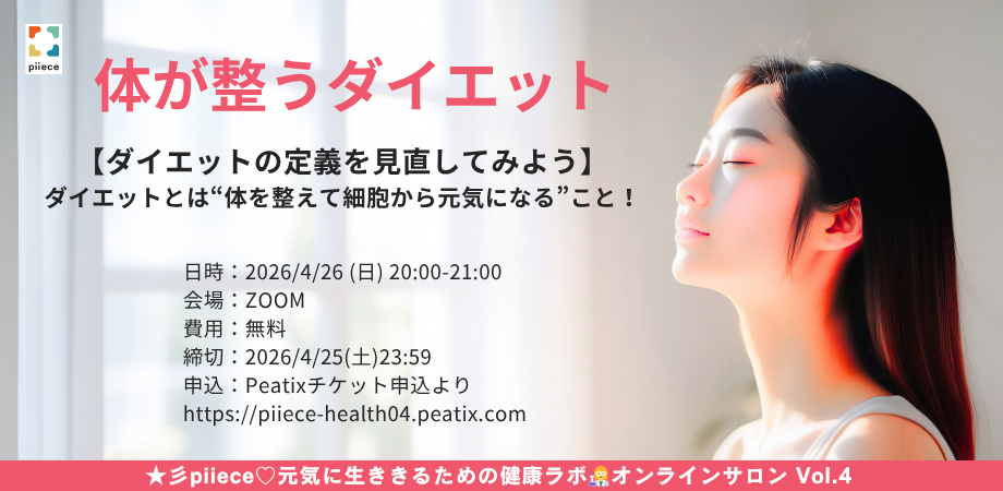 イベント詳細 ☆彡piiece♡元気に生ききるための健康ラボ👩🔬オンラインサロン Vol.4 【ダイエットの定義を見直してみよう】ダイエットとは“体を整えて細胞から元気になること!