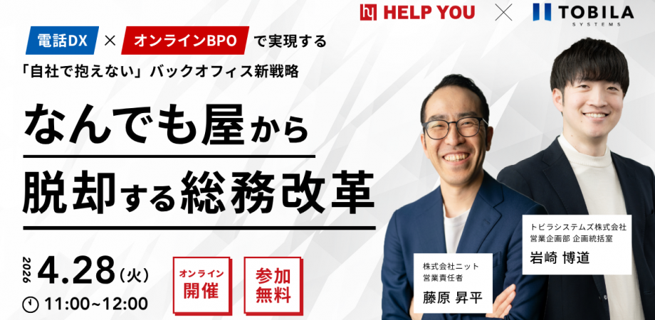 多くの企業で総務DXが進んでいますが、現場では「ツールを導入したのにうまく業務負荷を減らせない」「対応が増えたことでコア業務に集中できず、なんでも屋から抜け出せない」といった課題が依然として残っています。その1つの大きな要因として、電話対応の後に発生する記録・情報共有・対応判断といった【人手に依存した業務】があります。本セミナーでは、電話DXを牽引する「トビラシステムズ」による効率化の具体的な事例をご紹介。またその後工程に残る総務業務の構造も整理し、オンラインBPOの「HELP YOU」を活用した【自社で抱えない】バックオフィスの新しい在り方を解説します。総務の役割を単なる“作業”から“価値創出”へと転換し、社内外から評価される強い組織へと進化させるためのヒントをお届けします!