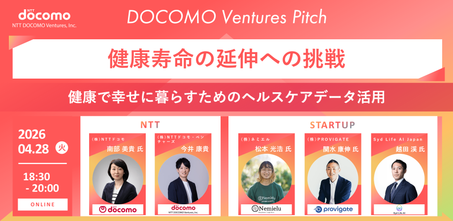 18:20 LIVE配信開始18:30 NTTドコモ・ベンチャーズの紹介18:40 NTTドコモ事業部の紹介:(株)NTTドコモ 南部 美貴 氏18:55 ドコモ・ベンチャーズから見たヘルスケア領域: (株)NTTドコモ・ベンチャーズ 今井 康貴19:10 登壇企業①:(株)ネミエル 松本 光浩 氏19:25 登壇企業②:(株)PROVIGATE 関水 康伸 氏19:40 登壇企業③:Syd Life AI Japan 越田 渓 氏 Lorena Puica 氏19:55 次回のご案内・クロージング※ピッチについては1社あたり約15分間で、前半8分がプレゼン、後半7分がQAセッションとなりますので、是非皆様からのご質問をお待ちしております!