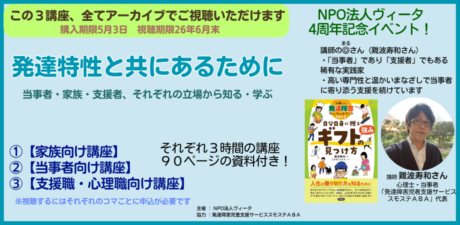 ※販売期限5月3日(日)、視聴期限6月末日2025年11月29~30日に行われた「発達特性と共にあるために」(講師:難波寿和さん)の中で開催された3つの講座のアーカイブ販売です。それぞれの講座で、時間が約3時間、90ページ前後の資料付き!!!◎さん(難波寿和さん)&とらっちのアフタートーク映像(約37分)も特典映像としてお付けします!前回の再販売期間が終了したあとも問い合わせが、当事者家族・当事者・支援職、それぞれの方に向けた講座ですが、家族や支援者の方には全部の講座を受けて欲しいと思います。◎さんの話を聞いて、別の立場からの話を知ることで気が付くことがたくさんあると感じました。【家族向け講座】・当事者が見えている世界はどんなものか? 表情が読めない、空気が読めないとはどういうことなのか? 感覚過敏や不注意、学習障害など・怒ったり、癇癪起こしたり、パニックになること意味と対処法・おやらくこらくプログラム(難波寿和さん独自プログラム) 子どもの世界をどう理解するか?子どものいいところを伸ばしていくために どんな声かけや、約束のしかた、ネット依存への対応・◎さんからの手紙(私は結構ここで感動してました)【当事者向け講座】・発達障害ってそもそもなんだろう?・失敗から学ぶ「コミュニケーションの極意とは?」・失敗から学ぶ「発達障害的信頼関係の築き方」・キーパーソンの探し方・いい顔をした悪い人の見分け方・HELPの出し方 など【支援職向け講座】・旨いラーメン屋の話(これはみんなに聞いて欲しい)・わたしたちぬきにわたしたちのことをきめるな・障害者権利とアドボカシー・問題行動への対応の仕方・死人テスト・適切な行動を増やす、問題行動の割合を減らす・行動システムを理解する(パニックや怒り)・支援は包丁・三日坊主の法則・問題行動減少に向けた支援👤 講師プロフィール難波 寿和(なんば ひさかず)臨床発達心理士・公認心理師。ABA(応用行動分析学)を専門に、発達障害者支援センターや児童養護施設などで活動。ご本人も自閉スペクトラム障害(ASD)と社交不安障害(SAD)の当事者であり、「当事者×支援者」の両方の視点から、実践的で温かな支援を展開している。著書に『14歳からの発達障害サバイバルブック』『こちら、発達障害の世...