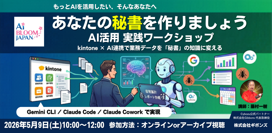 本ワークショップでは、多くの企業で使われている業務アプリ「kintone(キントーン)」を例に、自社のデータとAIを繋げて、日々の面倒な事務作業や集計をAIに任せる体験をしていただきます。