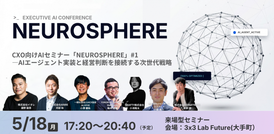 株式会社NEUROSPHEREは、2026年5月18日(月)、経営層・意思決定者を対象としたAI実装戦略カンファレンス「NEUROSPHERE」を大手町(3×3 Lab Future)にて開催いたします。