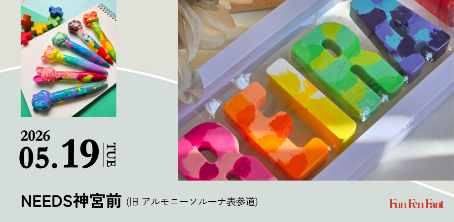イベント詳細 会場名が【NEEDS神宮前 by T&G WEDDING】に変更になりました。【予約可】ファーストクレヨンワークショップ海外で大人気のカスタムクレヨン お子様のお名前のアルファベットでお好きな色を選んで世界に1つだけのオリジナルクレヨンを作ってみませんか?お子様の知育玩具としてはもちろん、お子様が小さい時期にはフォトアイテムやインテリアとしてもお楽しみ下さい。 高い安全基準をクリアした人体に無害な素材を使用しているので、お子様でも安心してお使いいただけます。ぜひお子様への特別な贈り物を楽しく作って下さいね♡◎冷え固まるまで40~50分ほどお時間をいただきます。マルシェ等をご覧になりお待ちください。お時間がない場合は郵送対応(オプションチケット:500円)にて承ります。 ◎ご希望のアルファベットがある場合は、事前に予約フォームにて入力をお願い致します。 ◎アルファベットは全て大文字になります。