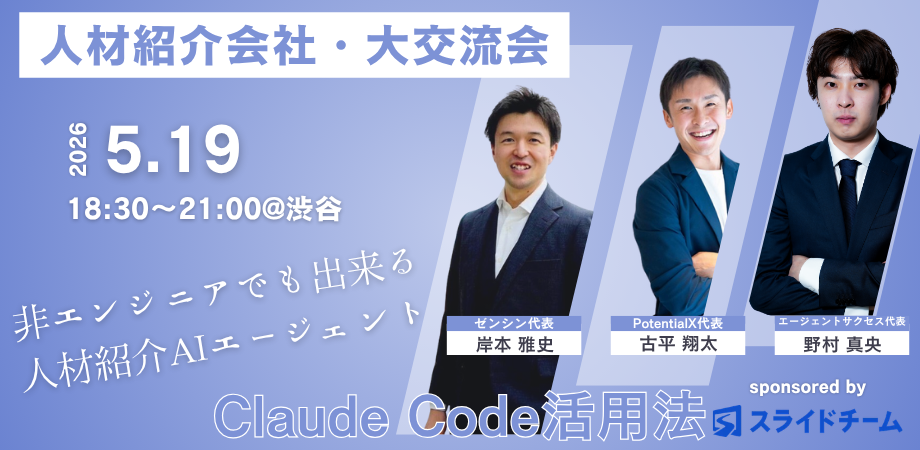 ——これら3社が共同主催する今回のイベントでは、AIの登場によって急速に変化する人材紹介業界の現場に焦点を当てます。皆様におかれましても、AI時代の事業戦略への転換について日々ご検討のことと存じます。そこで、人材業界の専門家の視点から、「Claude Code / AIエージェントを活用した人材紹介事業の推進の方法」についてトークセッション形式で深掘りします! 当日は、実際の事例を交えながら人材紹介の勝ち筋を探り、後半は交流会を実施します!