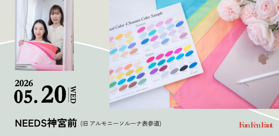 イベント詳細 会場名が【NEEDS神宮前 by T&G WEDDING】に変更になりました。*予約可* パーソナルカラー診断or顔タイプ診断パーソナルカラー診断(4タイプ)または顔タイプ診断(8タイプ)をお選びください。パーソナルカラー診断はご希望者のみ似合うチーク&リップ体験ができます。※パーソナルカラーと顔タイプで料金などが変わります。ご注意して時間帯をお選びください。※写真はイメージです【スケジュール】※5/20(水)開催①10時10分/A②10時25分/B③10時50分/A④11時15分/B⑤11時40分/A⑥12時05分/B⑦12時30分/A⑧12時55分/B⑨13時20分/A⑩13時45分/B⑪14時05分/A ⑫14時30分/B ⑬14時55分/A⑭15時15分/B ⑮15時40分/A▶参加費(税込)【A】パーソナルカラー診断:早割 3,500円/当日 3,800円【B】顔タイプ診断(8タイプ):4,000円※早割りはご参加日前々日の23:59までにご購入の方が対象となります。▶定員:各回1名様▶所要時間:20分▶注意事項・パーソナルカラー診断は正確に診断するため、なるべくノーメイクに近い状態でお越し下さい。 前髪をピンで固定させていただく可能性もございます。 ・顔タイプ診断は普段のメイクでお越し下さい。▶講師:Salon shape.【イベント概要】■FunFenFant公式サイト 公式サイトから来場予約いただいたお客様にプレゼントがございます。