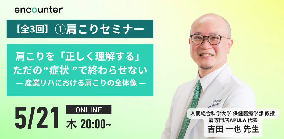 【概要】日時:2026年5月21日(木)時間:20:00開始(19:30開場予定)~21:30終了予定 対象:肩こりに関心のあるすべての方(医師・理学療法士・作業療法士・義肢装具士・柔道整復師・ATなど)受講費:・LIVE+2週間限定アーカイブ付チケット:3300円・ESO(encounter seminar online)会員(ログインID入力必須):無料(開催前日の20:00時締切) ※チケット申し込み終了時に1週間の無料トライアル後、本会員になられた方のみ対象です。・過去に登壇いただいた講師の方:無料(開催前日の20:00時締切)・第6期encounter school参加者:無料(開催前日の20時締切)受講方法:オンライン(zoom) 期間限定の...