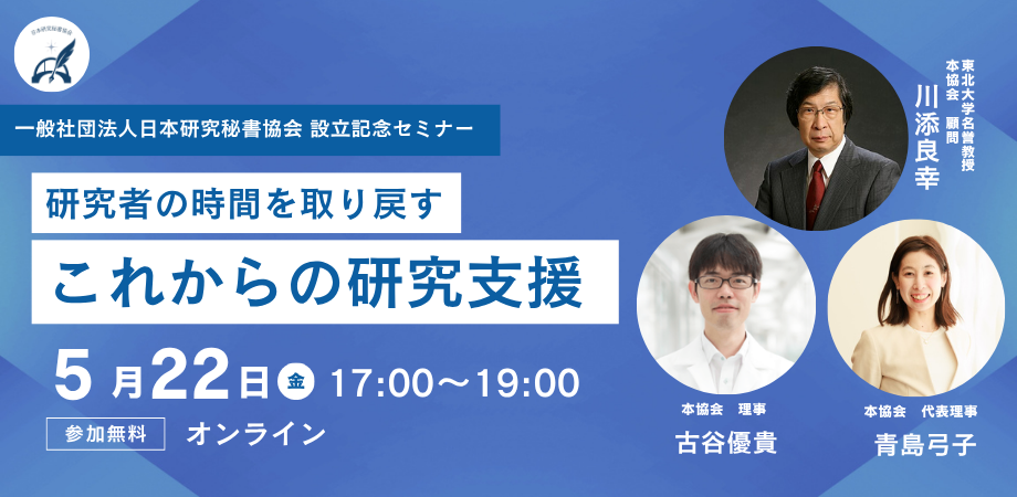 ※内容は変更となる場合があります17:00 – 17:10オープニング・趣旨説明17:10 – 17:40基調講演「研究を支えてきた秘書の存在とこれからの研究環境」川添良幸(日本研究秘書協会 顧問)17:40 – 18:05「研究者の現場から見た課題と研究支援へのニーズ」古谷優貴(日本研究秘書協会 理事)18:05 – 18:25「研究秘書協会が目指す人材エコシステム」青島弓子(日本研究秘書協会 代表理事)18:25 – 18:50パネルディスカッション「これからの研究支援のあり方を考え...